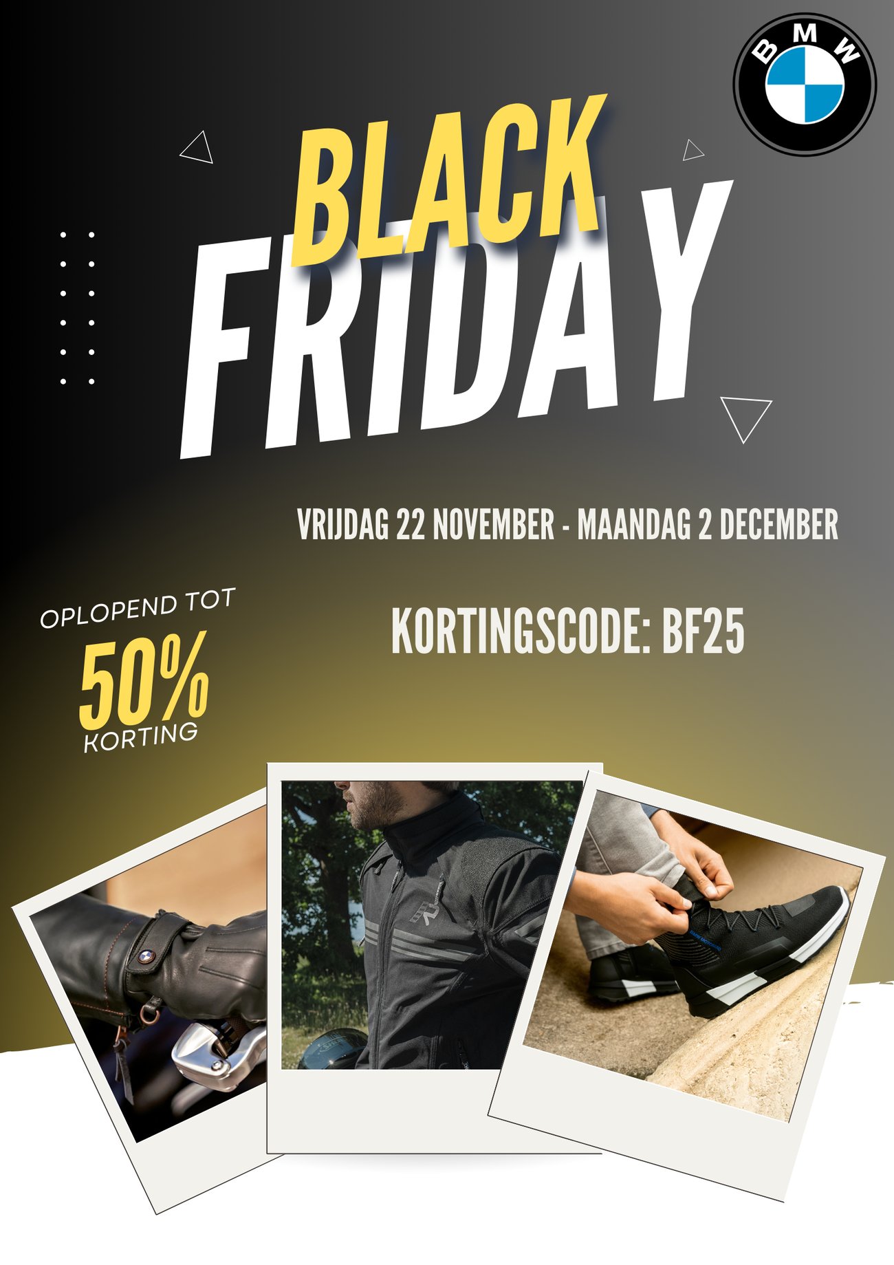 liefst 25% korting op alle motorkleding, helmen en lifestyle (excl. RUKKA), gebruik hiervoor de kortingscode BF25 tijdens het afrekenproces in de Webshop onder het kopje "waardebon toepassen".